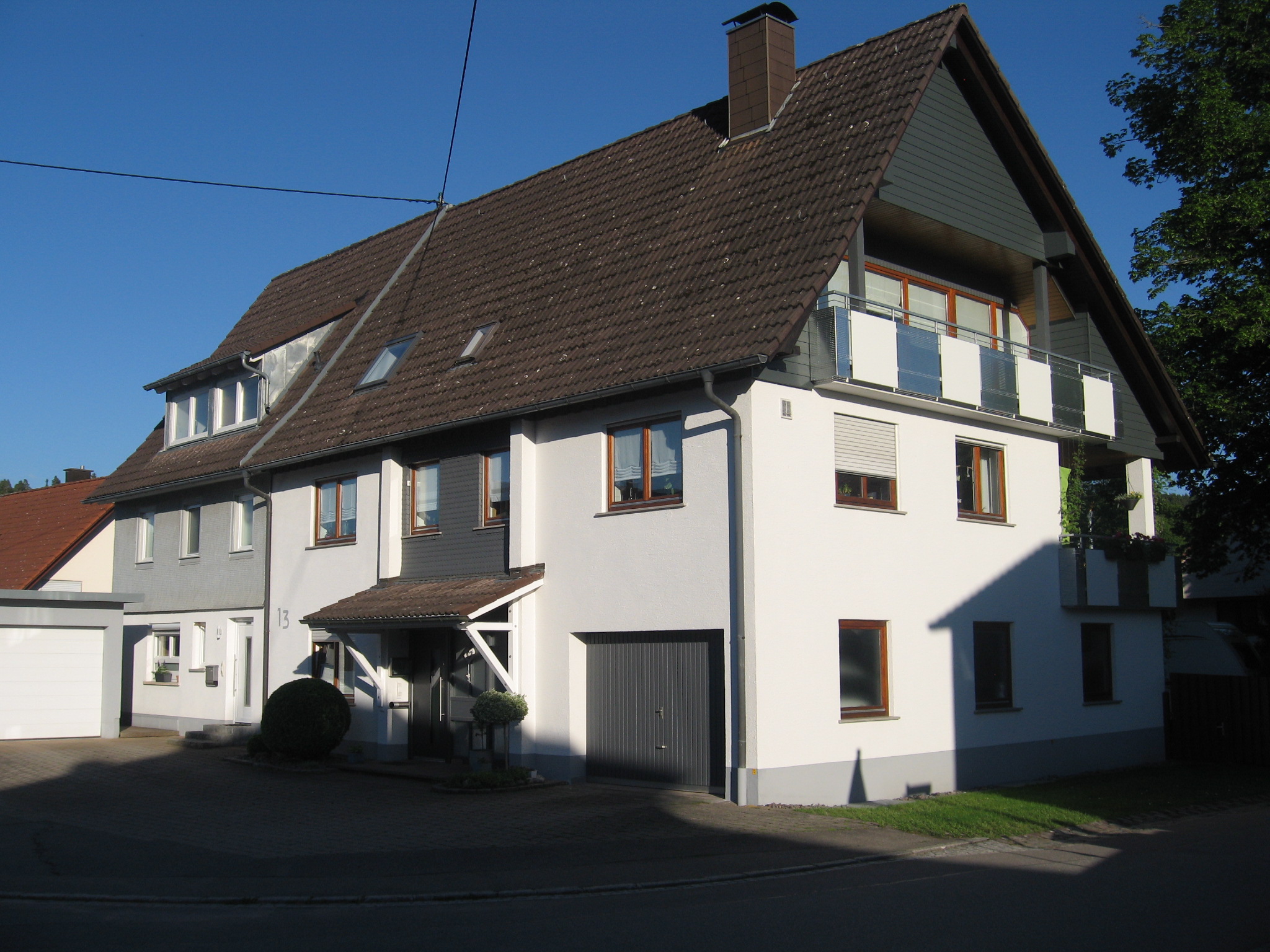Die gemütliche Ferienwohnung auf 2 Etagen ist in unserem 2-Familienhaus im 1.Stock untergebracht und liegt in sonniger, ruhiger und verkehrsfreier Lage. Eingerichtet ist sie für 1-4 Personen mit großer Einbauküche, gemütlicher Essecke, Schlafzimmer mit Doppelbett und 2 weiteren Einzelbetten im Dachstudio, welches über eine Treppe (steil) innerhalb der Ferienwohnung erreichbar ist. Vom Schlafzimmer und von der Küche aus gibt es einen direkten Zugang zum überdachten Balkon nach Südwesten(23 m²). Im Wohnzimmer befinden sich Tisch 2 Sofas und Hocker . Zudem gibt es 2 Fernseher. Die Wohnküche ist voll ausgestattet mit Spülmaschine, Microwelle, Kaffeemaschine Kühlschrank mit 40 l Gefrierfach und Radio. Das Bad verfügt über eine Dusche, WC, Waschbecken, Fön und Fenster.